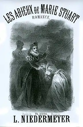 After the premiere, Niedermeyer was made a Chevalier (Knight) of the French Legion of Honour, but Marie Stuart had only a modest success.[4] It remained in the repertoire of the Paris Opera with some cuts to the score until 1846, after which it was largely forgotten. It was, however, revived in Stuttgart in 1877 (performed in German translation), and extracts from the work were performed by Zurich Opera at the 2002 Festival della Valle d'Itria in Italy.[2] Several pieces from the opera were published separately and were frequently performed in concerts and recitals. The most notable of these was Marie's aria in act 1 where she bids her farewell to France, "Déjà la nuit s'avance" (also known as "Les adieux de Marie Stuart").[5] It was performed in recitals by both male and female singers in the 19th century and continues to be performed today. It was also published in various arrangements for solo instrument including violin, piano, and flute.