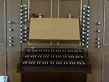 The organ was built during the Thirty Years' War between 1621 and 1624 by the organ-builder Georg Wagner of Lich and had around 20 registers with two manuals and a pedalboard, as well as wing doors on the sides.[34] The instrument was originally located where the Fürstenstuhl now stands. Between 1631 and 1633, the organ was expanded with the two pedal towers of the organ of Arnsburg Abbey which was probably also built by Wagner around 1607. These were brought to Lich to protect them from being plundered by Swedish troops. The Lich-based organ firm, Förster & Nicolaus Orgelbau relocated the organ in 1861 from the small gallery in the ambulatory to the west gallery and modified its tuning. The instrument was modified repeatedly by the firm over time. In 1913, a substantial renovation took place in the course of which the organ received tubular-pneumatic action, cone chests, a free-standing console, an expression pedal and several new registers. A further rearrangement followed in 1941 in the course of the organ reform movement. In 1961, the empty rear housing was refilled with new registers in a slider chest. A new organ with mechanical tracker action was installed in the old housing, incorporating the old registers, in 1972. Finally, further tunings were added in 2002, so that the modern instrument contains over 39 registers and can adequately reproduce a broad range of styles.[35]