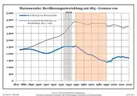 Development of population since 1875 within the current boundaries (Blue line: Population; Dotted line: Comparison to population development of Brandenburg state; Grey background: Time of Nazi rule; Red background: Time of communist rule)