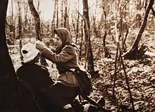 Between 20 and 26 July 1941 local KPJ leaders organised three Partisan detachments, armed with about 200 rifles and seven light machine guns, in the immediate vicinity of Drvar; one was the Kamenica Detachment.[12] Men from Kamenica had previously established a camp in a nearby forest for weapons and supplies. Bursać was one of the village's most active women, collecting food and clothing for the insurgents and serving as a courier for the Kamenica camp.[3] On 27 July the Partisans liberated Drvar, beginning the uprising in Bosnia-Herzegovina. Over the next few days, other parts of Bosanska Krajina were also liberated, although at this stage the KPJ had little control of the Serb villagers who took up arms.[13] The liberated area around Drvar and Bosansko Grahovo, under constant attack by the Ustaše, was defended by the Partisans from their surrounding positions. Bursać and other women from Kamenica joined Odbor fonda (the Funds Committee), collecting food, clothing and other supplies for the Partisans, and she made clothes for them from wool and cloth. She joined the League of Communist Youth of Yugoslavia (Serbo-Croatian Latin: Savez komunističke omladine Jugoslavije, or SKOJ) in September 1941.[14]