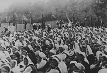 On 13 June 1942 Drvar was retaken by the Partisans, with Bursać's labour company clearing rubble and repairing houses in the town. The company also helped in working the land of families whose men were away fighting with the Partisans. In July, Partisan units composed of fighters from Serbia and Montenegro came to Drvar, and Bursać helped carry their wounded to field hospitals in the mountains.[15] She was one of the most active members of Kamenica's SKOJ organisation, which sometimes met at her house.[16] The Partisan-held territory around Drvar expanded significantly, and included the Sanica River valley in late July 1942. The valley's primarily non-Serb population had fled before the advancing Partisans, whom they feared because of Ustaše propaganda. The Partisan command engaged young people from western Bosanska Krajina to harvest wheat and other crops from the valley, transporting them to storage facilities on Mount Grmeč. The workers (mostly young women) were organised into military-style units, which were merged in mid-August into the four-battalion 1st Krajina Agricultural Shock Brigade.[17] Bursać was appointed political commissar of the 3rd Company of the brigade's 2nd Battalion.[16] Guarded by Partisan units, the brigade completed its work despite attacks by enemy planes.[17] Bursać was admitted to the KPJ at the end of summer 1942; at the beginning of 1943, she was president of the village committee of the United Federation of Anti-Fascist Youth of Yugoslavia (Serbo-Croatian Latin: Ujedinjeni savez antifašističke omladine Jugoslavije, or USAOJ).[18]