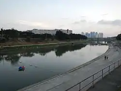In the Pamitinan Protected Landscape located in Sitio Wawa, Brgy. San Rafael, in Rodriguez, the Marikina River is dammed by Wawa Dam, a structure built during the early 1900s to provide water for Manila.[3] From Rodriguez, the river flows through San Mateo then to its namesake city of Marikina. In Pasig, the river meets the gates of the Manggahan Floodway, a controlled waterway used to prevent flooding in Manila during heavy rains by diverting most of the water of the Marikina toward Laguna de Bay instead of the Pasig River. Located 6.75 kilometres (4.19 mi) downstream is the confluence of the Marikina and Pasig Rivers.[4]
