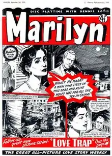 Amalgamated Press editor Robert Lewis had launched the digest-sized Love Picture Library in 1950 and found an unexpected audience with older girls and young women. A companion volume, True Life, joined it in 1952 and was again a strong seller, and in 1955 the company decided to publish Britain's first weekly romance comic.[2] Marilyn was a 24-page newsprint title, featuring duotone front covers (with a red overlay) and monochrome interiors. Inside it featured a mix of picture strips (both standalone and serialised stories), text stories and a smattering of features such as horoscopes and an agony aunt, in the form of Joan Courage.[3] The comic was published every Thursday.[1][4]