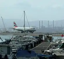 Gibraltar, the British Overseas Territory[1] at the southern end of the Iberian Peninsula,[2] has three marinas. These include Marina Bay, Ocean Village Marina, and Queensway Quay Marina.[3][4][5] Marina Bay is the largest of the trio and is located on Gibraltar's Westside, just outside the northern end of Gibraltar Harbour, in the Bay of Gibraltar, next to the airport runway.[3][6] It is adjacent to Ocean Village Marina which is just to its south.[3][7][8] However, Marina Bay now forms part of the Ocean Village Project.[6] Ocean Village Marina is the old Sheppard's Marina or Sheppard's Yard.[6][7] Marina Bay and Ocean Village Marina together have been incorporated into the Ocean Village Project, between the North Mole and the airport runway.[6][9][10]