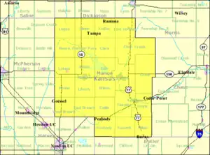 Originally, Marion County covered more than a third of the area of Kansas, including all the territory in the state south and west of the present northern and eastern lines of the county. The original location of the county was fixed by legislative act in 1860. It comprised less than the present area. The original boundaries were altered by an increase of territory on the west and a decrease on the south. In 1863, the legislature by special act fixed the boundaries to include all of southwestern Kansas. In June of that year, on petition of the citizens of the county, the governor restored the previous boundaries and ordered a separate organization of the county.[7] The south-eastern border one mile "notch" with Chase County was established under unusual circumstances. A murder had occurred and Marion County didn't want to have the trial, so a section one mile wide and eighteen miles long was ceded to Chase County to ensure the murder had occurred there.[8] The one mile strip of land remains in Chase County to this day. The present county boundary lines were decided upon in 1872 and contain twenty-four townships.[4]