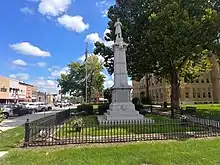 A monument that was "Erected to the memory of the soldiers, sailors and marines of all wars" was built on the northwest corner of the courthouse square and dedicated on November 11, 1920.[5] The 25-foot (7.6 m) granite shaft is capped with Union soldier from the Civil War. It is located where 40 soldiers enlisted under a tree on February 4, 1863. There is also a case in the courthouse that contains artifacts from the Civil War. There is another monument on the square to Knoxville resident Dixie Cornell Gebhardt, who designed the flag of the state of Iowa.