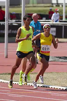 Arango Buitrago first became involved about a year after being approached by Chope. She first tried out running whilst blind at the Estadio Alfonso Galvis Duque and from there she developed a passion for the sport.[3] In 2011, she was selected for the Colombia national team at the IPC Athletics World Championships. She competed in two events, the 400m and 800m races. In the 400m qualifiers she was placed in the last of the three heats. Although she finished second behind Britain's Tracey Hinton, her time of 1:07.94 was the fastest losing time of the heats and she took the fourth space in the finals.[4] In the final, despite running a season's best of 1:05.88, Arango Buitrago finished outside the medals in fourth place. In the 800m qualifiers she posted a time of 2:31.31 in the second heat to go through in first place setting an area record. She ran a slower time in the final, but it was still enough for her to finish second behind the Czech Republic's Miroslava Sedlackova to collect the silver medal.[4]