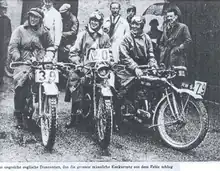 The Triumph was then used in a hill climb held by the Liverpool MCC. As the only female entrant and one of only 2 people out of 300 entrants to succeed in reaching the top of the hill she gained a lot of publicity.[5] She rode in her first motorcycle trial in 1920, the Blake Amateur Trial. After winning a gold medal in the North Wales Open Trial a motorcycle manufacturer in Wrexham, Powell, gave her a works supported machine.[6] She later had works support from Raleigh, BSA[7] and Triumph.[8] Works support ranged from a specially prepared new machine along with some financial support to a small discount on spares. British motorcycles were exported worldwide, and many were marketed on competition success. Therefore. the riders as well as the makes became famous.