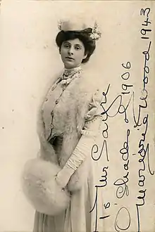 Wood's stage career included parts in Strongheart (1907), Mary Jane's Pa (1908),[2] The Call of the North (1908),[3] The Third Party (1914),[4] Yes or No (1918),[5] Madame Pierre (1922),[6] Yellow (1926),[7] The Good Earth (1933),[8] and Chu Chin Chow (1919-1921), "an Oriental extravaganza".[1][9] When she played a telephone operator in The Woman (1912), she was invited to visit a large telephone exchange in Chicago, to meet women who did that job in real life.[10][11]