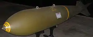 The M118 is an air-dropped general-purpose or demolition bomb used by United States military forces. It dates back to the time of the Korean War of the early 1950s. Although it has a nominal weight of 3,000 pounds (1,400 kg), its actual weight, depending on fuse and retardation options, is somewhat higher. A typical non-retarded configuration has a total weight of 3,049 pounds (1,383 kg) with an explosive content of 1,975 pounds (896 kg) of tritonal. This is a higher percentage than in the more recent American Mark 80 series bombs thus the designation as a demolition bomb.