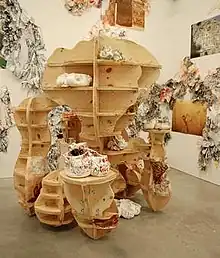 His paintings and sculptures made with fiberglass pieces, layered with rice paper, paint, silk-screens, and varying images and patterns, "explore dualities of culture and meaning."[1] The Museum of Fine Arts, Boston, Boston College Museum, Capital Children's Museum in Washington, DC, DeCordova Museum and Sculpture Park, and the Whitney Museum of American Art at Philip Morris, New York, New York.[1] He has received various public art commissions and grants from the Boston Medical Center, an Artist Fellowship Grant through the Massachusetts Cultural Council, and a Gund Travel Grant (Bali), and a special commission for the new Comme des Garçon store in New York City.[1]