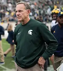 Mark Justin Dantonio (born March 9, 1956) is an American football coach and player. His most recent head coaching position was at Michigan State University, a position he had held from 2007 to 2019, presiding over one of the most successful eras in the program's history. He led the Michigan State Spartans to three Big Ten Conference championships, and eight victories over archrival Michigan in 13 years. In 2013, he coached Michigan State to its first 13-win season[1] and the program's fifth trip to the Rose Bowl, where they defeated Stanford and finished the season ranked No. 3 in the nation.[1] This was the second time a Big Ten team reached the 13-win mark, the previous being Ohio State's national championship season in 2002, where Dantonio was the defensive coordinator. The 2013 season also marked the first time a Big Ten team won nine conference games each by double digits. In 2015, Dantonio became the first head coach in Big Ten history to achieve at least 11 wins in five of six seasons. On December 6, 2015, Dantonio's Spartans qualified for the College Football Playoff for the first time in the program's history.