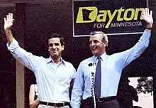 Dayton ran for the U.S. Senate in 1982 against Republican Party incumbent David Durenberger. He defeated former U.S. senator Eugene McCarthy in the Democratic primary, and the general election became one of the most expensive in state history.[3] Dayton campaigned as a populist in opposition to Reaganomics and famously promised "to close tax loopholes for the rich and the corporations—and if you think that includes the Daytons, you're right."[3] Durenberger won the election, and Dayton returned to the Perpich administration until his election as Minnesota State Auditor in 1990.[2]