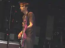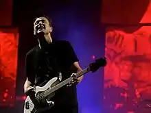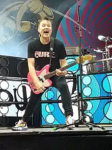 Hoppus describes himself as "pretty straight" until junior high, when he began skateboarding and listening to punk rock.[8] In his early high school years, he lived in Fairfax, Virginia, attending nearby Annandale High School during his second year; he received his first bass guitar during this time and attended his first concert, They Might Be Giants, at the 9:30 Club shortly before his 16th birthday.[9] He recalled, "I didn't know where I should stand or what I should do, so my friends and I bought some menthol cigarettes and smoked for the first time and tried to look as cool as we could. We probably looked like idiots."[10] He received his first bass (a Mako) as a gift from his father, purchased at a local music shop in Annandale.[11] He earned money for a set of amplifiers by helping him paint his house.[5][12] Hoppus never took bass lessons, instead teaching himself by playing to bands such as the Descendents, The Cure, and Bad Religion.[12] He has remarked that "Silly Girl" by the Descendents was the "song that made [him] fall in love with punk rock music [...] that song changed [his] life forever".[13] He borrowed a cassette tape of The Cure's album Kiss Me, Kiss Me, Kiss Me from his friend Wendy Franklin the summer following junior high school, and was taken with the song "Just Like Heaven".[10][14]