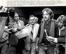 In 1976, McKinnon moved to Austin, Texas,[13][16] where he earned a living as a musician.[15] McKinnon enrolled at the University of Texas at Austin and served as editor of the student newspaper The Daily Texan during 1980–1981.[12][15] While working for the newspaper, he was jailed briefly on a First Amendment issue after refusing to provide to police unpublished photographs of an Iranian student protest.[11] During this period he also investigated Child prostitution rings he alleged operated within Texas, discussing his findings on the public access TV show, Alternative Views.[17] He left the university before completing his undergraduate work.[15]