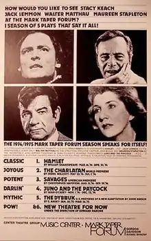 The production of such plays as Murderous Angels, The Dream on Monkey Mountain, Children of a Lesser God, Savages, The Shadow Box, The Kentucky Cycle and Angels in America has established definition of a "Taper play"; one which is provocative, political and liberal.[7]