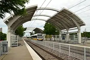 Market Center station is a DART Light Rail station in Dallas, Texas. It serves the Green Line and Orange Line.[2][3] The station opened as part of the Green Line's expansion in December 2010. It serves nearby locations such as the Infomart and Dallas Market Center and the Oak Lawn neighborhood.