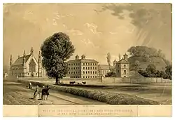 ![]() An early 19th century Lithograph showing the motte of Marlborough Castle (right) within the grounds of the newly established Marlborough College. | |