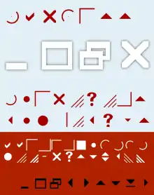 | 6x | โ[lower-alpha 1] | โ | ๐ญฝ | ๐ญฟ | โพ[lower-alpha 3] | โ[lower-alpha 4] | โฌ[lower-alpha 1] | โข | โ | โ[lower-alpha 5] | โ[lower-alpha 6] | โ[lower-alpha 7] | โ[lower-alpha 8] | โฌค[lower-alpha 1] | ๐ฎ | |