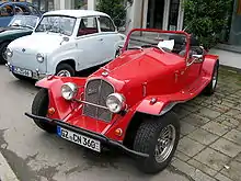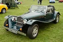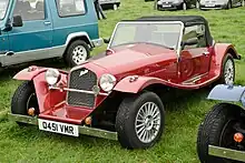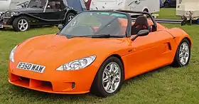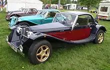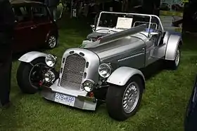 The Roadster was the original car and was based around Triumph Herald range components (e.g., Spitfire, Herald, Vitesse, GT6). The two seat body built of aluminium and glass fibre had a radiator grille slightly similar to pre-war Alfa Romeo sports cars. As standard, any of Triumph's 4- or 6-cylinder engines of the time could be fitted (1147-2498cc), along with overdrive or non-overdrive gearboxes. In 1981 the Morris Marina became the donor car replacing the Triumph and the Marina engine became standard although many customers fitted engines, gearboxes and back axles of their own choice. Fitted with the two-litre inline-six from a late Triumph Vitesse, a top speed of 177 km/h (110 mph) was achievable.[5]