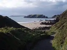 Marloes Sands (Welsh: Traeth Marloes)[1] is an approx. 1.5 kilometres (0.93 mi) long remote sandy beach in Pembrokeshire, Wales, near the village of Marloes. It's broadly curved and surrounded by cliffs. Walking on the beach gives great views of Skokholm Island and Gateholm Island.