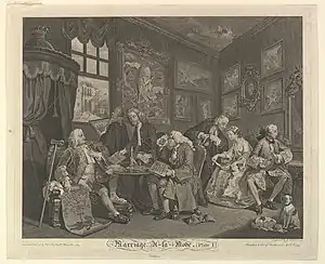 The Marriage Settlement is the first in the series of six satirical paintings known as Marriage A-la-Mode painted by William Hogarth, named after the historical legal arrangement of a Marriage settlement.