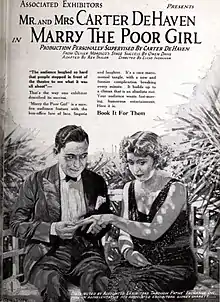 Marry the Poor Girl is a 1921 American silent comedy film directed by Lloyd Ingraham and starring Carter DeHaven and Flora Parker DeHaven.[1] It was based on the 1920 Broadway play of the same name by Owen Davis.The Exhibitor's Trade Review noted that the "excellent" supporting cast were not credited onscreen "possibly because it was intended to keep only the two principals in the limelight".[2]
