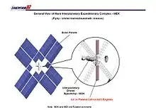 The idea of Marpost was then picked up by Leonid Gorshkov, one of the main designers of the RKK Energia (Raketno-Kosmicheskaya Korporatsiya – Rocket-Space Corporation) company, the leading Russian space developer and builder of human spaceflight hardware.[2] Gorshkov proposed to use the space complex called MEK (Mezhplanetniy Ekspeditsioniy Komplex, or Interplanetary Expeditionary Complex), that was already developed and designed by RKK Energia. The projected cost would be $14–16 billion and the period of realization would be 12–14 years. The elements of MEK were initially proposed to be launched by the Energia heavy booster. Later however, in order to lower the cost of the mission, the elements of MEK were proposed to be launched by a Proton or Angara rocket. The overall mass of MEK is estimated at 400 tons. The flight from Earth orbit to Mars would be powered by ion thruster engines.[3]