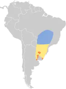 It is found in Argentina, Brazil, Paraguay, and Uruguay. It is migratory, breeding in wet grasslands and marshes around Uruguay and Argentina and migrating northwards in the austral winter to wet and dry grasslands in southern Brazil.