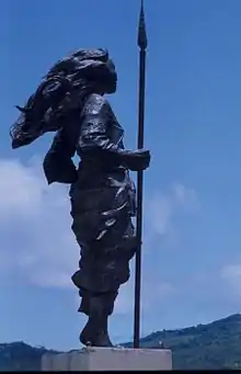 Several monuments have been dedicated to Tiahahu. In Ambon, capital of the province of Maluku, an 8-metre (26 ft) tall statue of her holding a spear was erected in 1977; it stands in Karangpanjang overlooking the Banda Sea.[3] In Abubu, a statue of her leading soldiers while holding a spear was erected and dedicated on the 190th anniversary of her death.[2][3] She also has several items named after her, including a street in Karangpanjang, Ambon, and a warship, the KRI Martha Christina Tiahahu.[3]