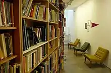 Starting in November 2005, e-flux sponsored the "Martha Rosler Library," a reading room in which over 7,500 volumes from her private collection were made available as a public resource[24] in venues in and around art institutions, schools, and libraries.[25] The collection started at e-flux's New York gallery and then traveled to the Frankfurter Kunstverein in Germany; to Antwerp's NICC, an artist-run space, in conjunction with the MuHKA (Museum of Contemporary Art); to United Nations Plaza School in Berlin; to the Institut National de L'Histoire de L'Art in Paris; to Stills in Edinburgh; to John Moore's Art School in Liverpool; and to the Gallery at the University of Massachusetts, Amherst, before being retired. At the "Martha Rosler Library," visitors could sit and read or make free photocopies. Other projects, such as reading groups and public readings, were organized locally in conjunction with the project.[26]