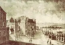 The castle was built from 1478 to 1481 at the order of Diether von Isenburg. Its position suggests that the Archbishop and Elector did not have it built as a defense against strangers, but as a retreat against the citizens of the city of Mainz.[1] The actual location of the electoral residence in the city center, next to the Cathedral, had become uncertain in the Mainz Diocesan Feud. The location of the castle on the banks of the Rhine on the other hand allowed a quick escape to the other residence places Eltville and Aschaffenburg. The arrangement of the trench towards the city favors this thesis.