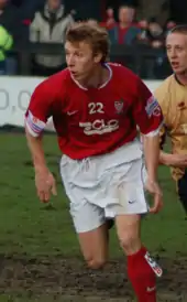He had a trial with Stockport County of League Two during their pre-season trip to Ibiza in August 2006, but was not offered a contract.[19] He was being tracked by Hartlepool United and York City,[19] and also attracted interest from Guiseley.[21] He eventually signed for Conference National club York on 31 August for an undisclosed five-figure fee after having made four appearances and scored one goal for Frickley at that point in 2006–07.[22][23] He made his debut a day later in a 0–0 draw with Stafford Rangers after coming on as a 57th minute substitute.[24] During his first start for the team, he was substituted for goalkeeper Arran Reid in the 17th minute after Tom Evans was sent off.[25][26] He scored his first goal for York in the team's 3–2 home loss to Morecambe on 12 September.[27] A week later, he scored both York's goals in a 2–1 away victory over Woking.[28] He featured in both legs of York's play-off semi-final defeat by Morecambe 2–1 on aggregate and finished 2006–07 with 45 appearances and eight goals,[29] after which the club exercised their option to extend his contract for another season.[30]