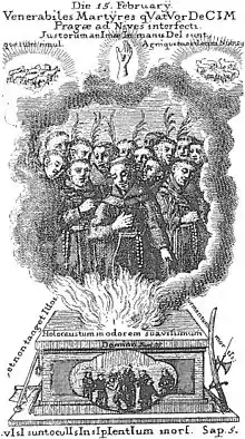 Four of the men were Czech while there was one Spaniard, one Frenchman, four Italians, three Germans, and one Dutchman. Three were clerics in the order while another three were novices since the rest were all ordained priests.[1][2] The Franciscans settled in Prague in 1604 and set out to administer the sacraments as well as to tend to the ill and the poor. The friars became known for their preaching despite the consistent threats levelled against them from those in non-Catholic denominations. The fourteen were slain in Prague after Emperor Rudolf II invaded Prague; the fourteen were surprised at the sudden attack on their convent at the Church of Our Lady of the Snows and were all slain at the hands of a Lutheran mob.[2]