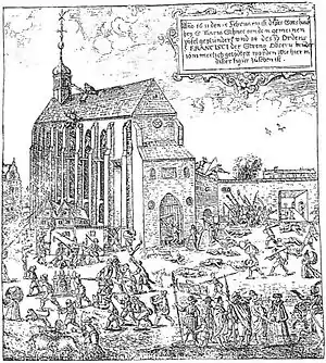 Tensions came to a head on 15 February 1611 after armed forces under the command of Rudolf II invaded Prague to consolidate his empire. The fear in people and in particular the Lutherans saw Prague explode into crisis; it saw radical movements attack Catholics which led to a crowd of almost two thousand men breaking into the Franciscan convent under the mistaken assumption that some Catholic soldiers were at the convent since the Franciscans would provide shelter and protect them.[2] The Dutch friar Cristoffel Zelt was the first slain as he carried firewood to the oven. The German cleric Klemens was the next killed when he was struck with an axe before the French priest Simon was stabbed to death in his sickbed. The next to be killed was the Milanese friar Girolamo dei Conti Arese as he was before the image of the Mother of God. Both the Italian priest Bartolomeo Dalmasoni and religious Giovanni Bodeo were killed as the people hurled insults and blasphemies at them. The mob proceeded to kill the Spanish priest Juan Martínez in his attempt to protect the Eucharist and had his arm cut off in the melee before his skull was smashed. The Czech vicar Bedřich Bachstein was the next one killed as he hid in the bell tower with the novices Jan and Antonín alongside the kitchen assistant Emanuel. The mob located them and beat them before hurling their bodies down from the tower to the ground below. The Italian subdeacon Gaspare Daverio was located near the bell tower and torn to pieces before his remains were thrown out of the window before the German duo Jan Didak and Jakob were likewise slain.[1][3] The attack lasted no longer than three hours but left the fourteen friars dead and their convent and church in ruins.