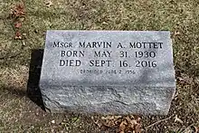 As his health declined, Mottet moved to the Kahl Home in Davenport. In June 2016 Msgr. Mottet celebrated his 60th anniversary of ordination. He died three months later at the age of 86 on September 16 at the Kahl Home.[4] His funeral was held at Sacred Heart Cathedral on September 21, 2016, and he was buried in Mount Calvary Cemetery in Davenport.[12]