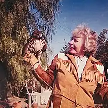 Mary Holmes posing with her falcon