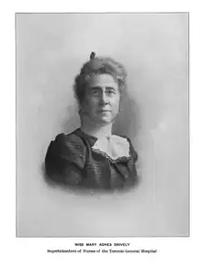 Mary Agnes Snively was born in St. Catharines, Canada West, to Martin Snively, born in Upper Canada, and Susan Copeland, born in Ireland.[1] She was Lady Superintendent of Nurses at the Toronto General Hospital's School of Nursing from 1884 to 1910, where she established the first nursing student residence and a proper curriculum.[2]