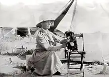 She bought a puppy “Muggins”, while in Salonika, and the dog would visit patients with her, appearing to show sympathy to them. Muggins was later brought to London where he accompanied Blair when she was giving medical lectures. The dog died in 1930. It can be seen with Dr Blair in this photograph taken while they were in Salonika during the war.[20]
