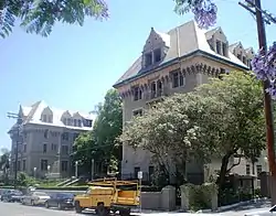 The building, designed by Arthur Burnett Benton (1858–1927),[11][12] with many gables, cupolas, turrets and balconies, was turned over to the YWCA, having been built and furnished at a total cost of $500,000.[13] Not less than 3,000 persons visited the home for the first public reception in May 1913, and the Los Angeles Times described the building, lawns and rose garden as a "Visitors' Mecca."[7]