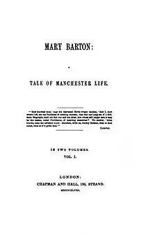 Mary Barton was first published as two volumes in October 1848.[Note 1] Gaskell was paid £100 for the novel.[4] The publisher Edward Chapman had had the manuscript since the middle of 1847. He had several recorded influences on the novel, the most prominent of which is probably the change in title: the novel was originally entitled John Barton. Gaskell said that he was, "the central figure to my mind...he was my 'hero'." He also encouraged Gaskell to include chapters 36 and 37, the dialectical glosses added by William Gaskell, a preface and the chapter epigraphs.[1]