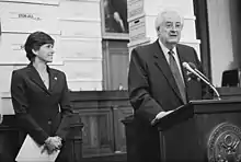 Mary Bono with Henry Hyde during a press conference related to the impeachment inquiry against Bill Clinton