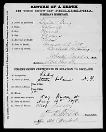 Aaron Burr never acknowledged the fact that he had a relationship or children with Emmons during his lifetime – nor did he mention his children with Emmons in his will, even though he did mention two of his other illegitimate children in it.[9] Additionally, the death certificates of both Louisa Ann and John Pierre both leave the slots for "Mother" and "Father" blank.[10][6] However, according to a descendant of Burr and Emmons, historian Dr. Allen Ballard, Emmons married Burr shortly after his first wife Theodosia's death, which would have legitimized their two children.[2]