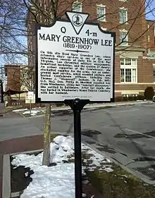 In 2011, one of Lee's journals was published, titled The Civil War Journal of Mary Greenhow Lee. It was transcribed and edited by Eloise C. Strader, a former president of the Winchester-Frederick County Historical Society.[5] In July 2013, the VDHR approved the placement of a historical marker at the site of Lee's house, now demolished.[7] The following November the marker was installed at 132 N. Cameron Street, next to The George Washington Hotel. A dedication ceremony was hosted by the Winchester-Frederick County Historical Society, which paid for the marker, with speeches made by the organization's president and the chairman of the VDHR.[8] The historical marker states:
