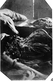 The pericardium was open below and the heart absent. In the abdominal cavity, there was some partly digested food of fish and potatoes, and similar food was found in the remains of the stomach attached to the intestines.[99][n 12]