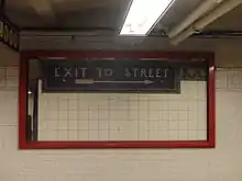 Framing Union Square] (installed 1998),[11] New York City, Miss collaborated with architect Lee Harris Pomeroy to create 125 red frame elements scattered throughout the 14th Street–Union Square station. The red elements highlight the disappearance of lost infrastructure as well as industrial elements that remain.
