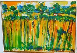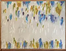 In 1956, a critic labeled her paintings "color-patch abstractions" and a year later another called them "'tachist' color impressions".[31][51] Explaining her technique in 1959, Orwen said she was seeking to convey rhythmic patterns that exist "beneath the complexity of life." By means of "the glob of paint, the drip, the patch of color," she said she aimed to depict the "sensations of space" (the "tension and movement between forms and colors").[1] At this time, she also used a quote by Henri Matisse to convey her search for the "essential character" of her subjects so as to give a "lasting interpretation" by means of her paintings.[37]