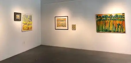 In 1961, Orwen and her family moved to West Virginia, and she, then an art instructor at Bethany College, participated in an exhibition with twelve other art teachers at Grove City College in nearby Pennsylvania.[39] Despite the move, she also continued to exhibit in at the Jefferson Place Gallery (a solo in 1967) and at the Baltimore Museum of Art (in a major review called "Twenty Years of Washington Art" in 1970).[9] Not long after the move to West Virginia, Orwen and her family moved again, this time to Geneseo, New York, and she began to show in that vicinity, starting with a show at the annual Western New York art exhibition held in March 1964 at the Albright–Knox Art Gallery. There, a painting of hers called "Sea Chant No. 4" was one of many prize winners.[40] Over the next twenty-five years, she participated in group and solo exhibitions at commercial galleries as well as museums and other non-profit organizations in the Rochester region.[9][41][42] Notable exhibitions include solo shows at the Oxford Gallery in Rochester (1974), the Rochester Branch of the American Association of University Women (1983), and the Arts and Cultural Council for Greater Rochester (1991).[9][42][43] In 1978, Watkins Gallery of American University gave her a solo exhibition. The following year and in 2001 she contributed paintings to group exhibitions in New York commercial galleries (David Findlay, 1999, and Gary Snyder, 2001).[9] In 2019, Cody Gallery, Marymount University, presented an exhibition of Orwen's paintings. The show was the second in a series called "Women of Jefferson Place Gallery". Others in the series included Jennie Lea Knight and Hilda Thorpe. Installation views from the Orwen exhibit are shown above.