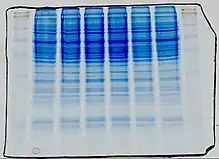 - ↑ AL Shapiro, E. Vinuela, and JV Maizel., Jr. (1967) "Molecular weight estimation of polypeptide chains by electrophoresis in SDS-polyacrylamide gels." Biochem. Biophys. Res. Commun. 28: 815–820,