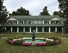 Originally, Babcock envisioned selling 500 acres to establish a veterans hospital, but the idea was met with ire. In a letter to her sister, she wrote: "Everyone I asked blew up over Reynolda becoming a vets’ hospital...I guess Reynolda will go on to live a longer life and end as an ancient ruin.” When the Z. Smith Reynolds Foundation offered Wake Forest University annual financial assistance in return for the college moving to Winston-Salem, she donated the initial 350 acres for the new university's grounds, eventually to a total gift of 605 acres.[12] A groundbreaking ceremony for the new campus was held in 1951 and attended by President Harry S. Truman, who gave the keynote speech of the day. A lunch reception was held in Reynolda's central reception room; afterwards President Truman took a nap on the sofa of R.J. Reynolds' study.[13]